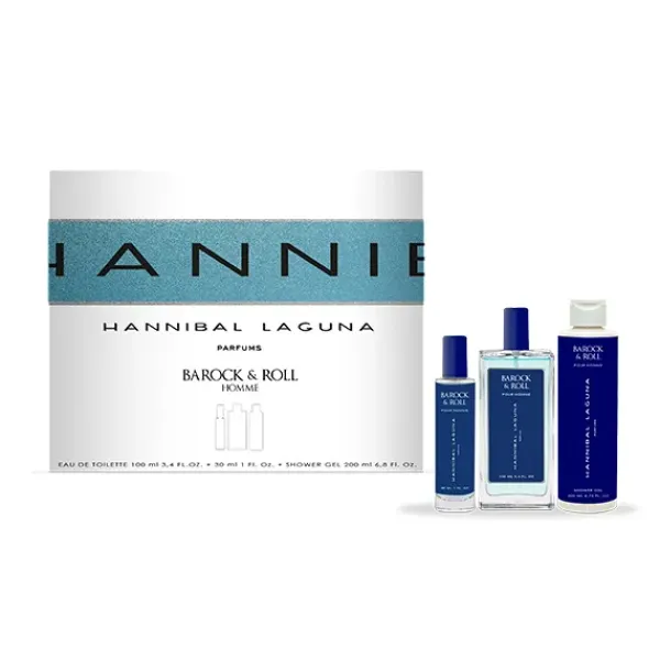 Estuche triplo de Hannibal Laguna, que contiene la fragancia Barock & Roll, perteneciente a la genealogía de las fragancias aromáticas con carácter fougere.
