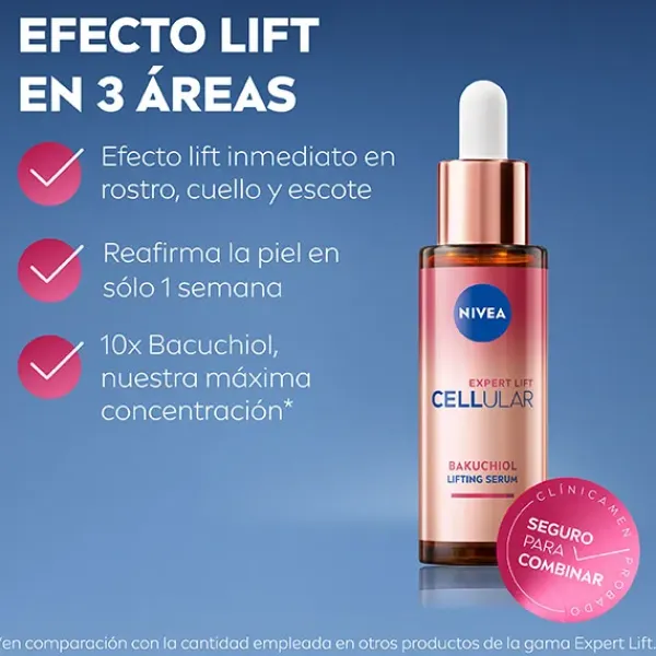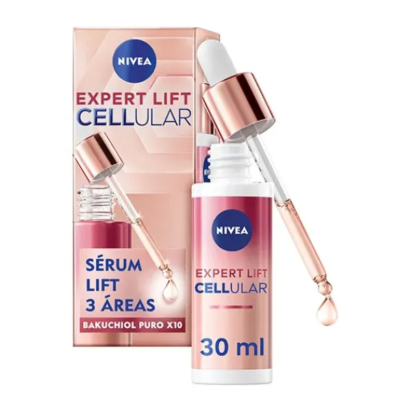 NIVEA Cellular Expert Lift Sérum Bakuchiol 3 Áreas es un sérum es una solución eficaz que trabaja a nivel celular en: