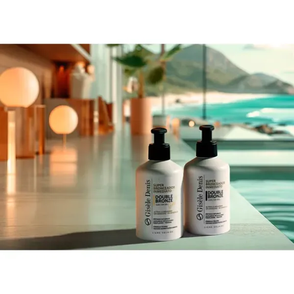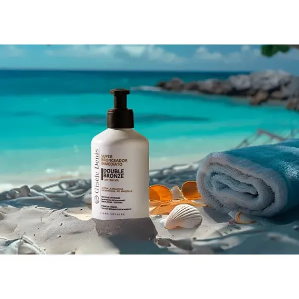 El Super Bronceador Inmediato Corporal Double Bronze de Gisèle Denis genera, acelera y potencia el bronceado de forma natural proporcionando un tono saludable y uniforme. Su innovadora fórmula ejerce una doble acción sobre la producción de melanina.
