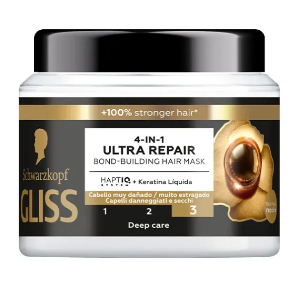 Desarrollada para cabellos dañados y secos, la Mascarilla Ultimate Repair 4 en 1 contiene una fórmula con Keratina Líquida + HaptIQ System que fortalece y reconstruye en profundidad la estructura capilar, +100% cabello más fuerte y hasta 10 veces más resistencia 1 y brillo. ( vs. cabellos sin tratar). Con Keratina Líquida, que repara el cabello en profundidad, dejándolo suave y brillante.