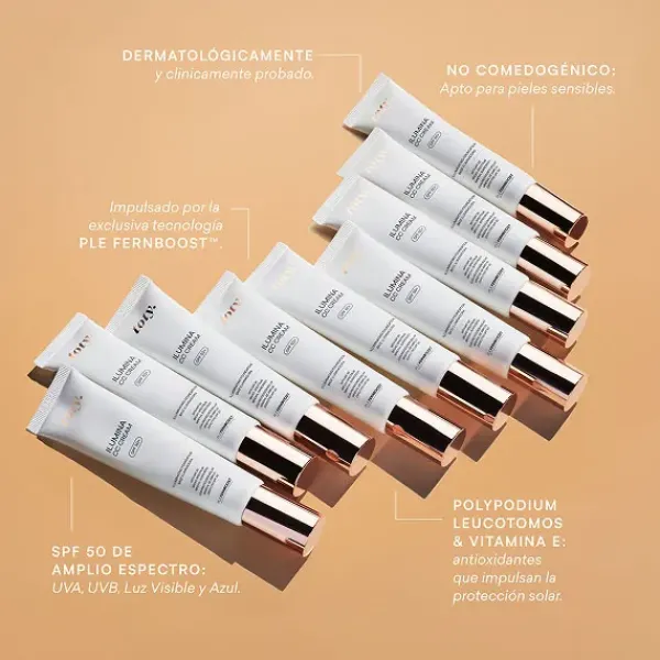 – Proporciona Protección Factor (SPF) 50 de amplio espectro: UVA, UVB, Luz Visible y Azul