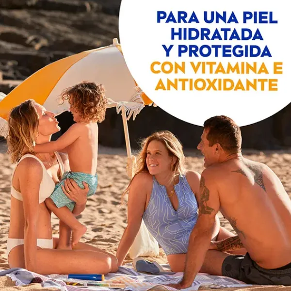 NIVEA SUN Protege & Hidrata Loción Solar FP20 protege la piel desde el exterior & el interior. Ofrece protección frente a los rayos UVA/UVB, las quemaduras y el envejecimiento prematuro de la piel, además de estimular la protección de la piel desde el interior gracias a la Vitamina E, un poderoso antioxidante, que activa el mecanismo de defensa de la propia piel. Además, mantiene la piel hidratada durante 48h.