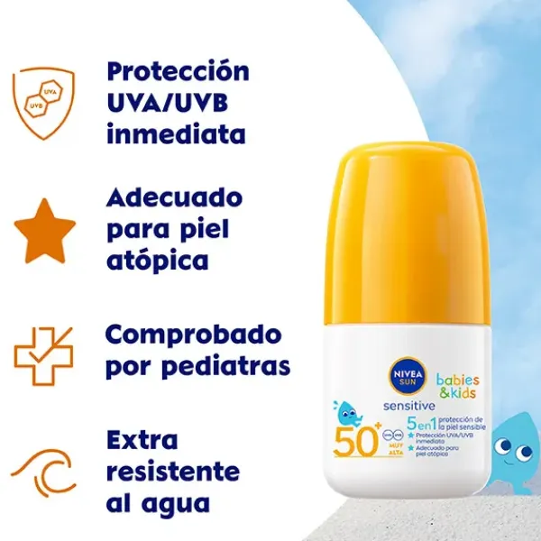 NIVEA SUN Babies & Kids Sensitive Roll-On Solar SPF 50+: Brinda protección 5en1 para la piel sensible contra los daños de los rayos UVA/UVB a largo plazo y quemaduras. Reduce el riesgo de sufrir alergias inducidas por el sol, es libre de fragancia, y es extra resistente al agua. Adecuado para la piel atópica, comprobado por pediatras. Respetuosa con los océanos: Sin los filtros UV Octinoxato, Oxybenzona, Octocrileno y libre de microplásticos.