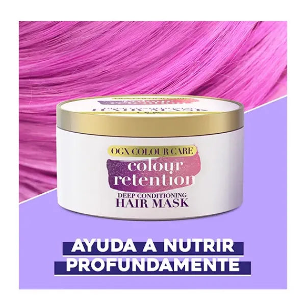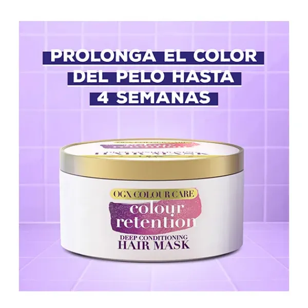 La OGX Retención de Color, Mascarilla Capilar Hidratante con Tecnología Bond Plex está diseñada para ser una mascarilla para el cabello profundamente acondicionadora que ayuda a suavizar y fortalecer las hebras dañadas y prolonga el color hasta 4 semanas. Esta mascarilla para el pelo teñido ayuda a dar suavidad y un color brillante que dura. La tecnología Color Bond Plex está creada para evitar el daño de los rayos UVA y UVB.