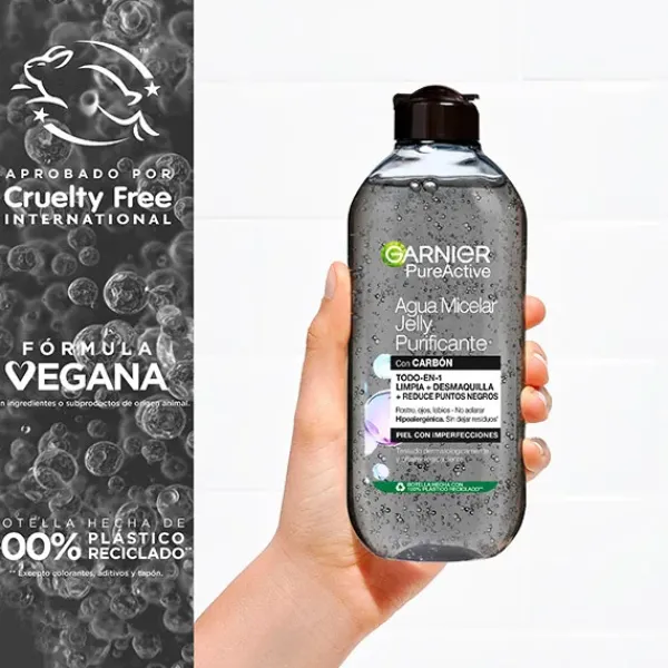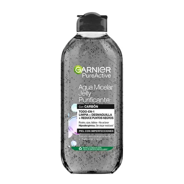 Limpia, desmaquilla y purifica tu piel en una pasada con el agua micelar de carbón y ácido salicílico en gel Garnier Pure Active: Reduce en un 44% las imperfecciones y en un 29% los puntos negros.