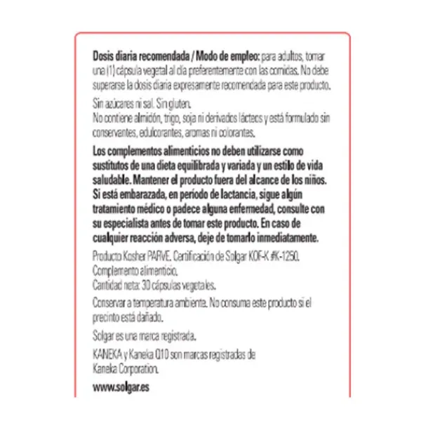 Coenzima Q10 (CoQ-10) 60 mg de Solgar® contiene Kaneka Q-10 ubiquinona, una forma patentada de CoQ-10 fermentada en levadura con alto grado de pureza, que es biológicamente idéntica a la CoQ-10 que produce el organismo.