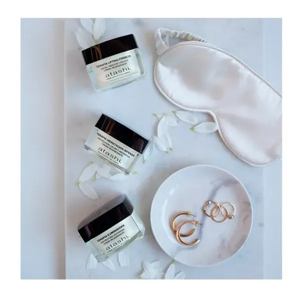 Atashi Terapia lifting firmeza es una crema efecto lifting regenerante que previene la pérdida de elasticidad y firmeza al mismo tiempo que ilumina y alisa la piel.