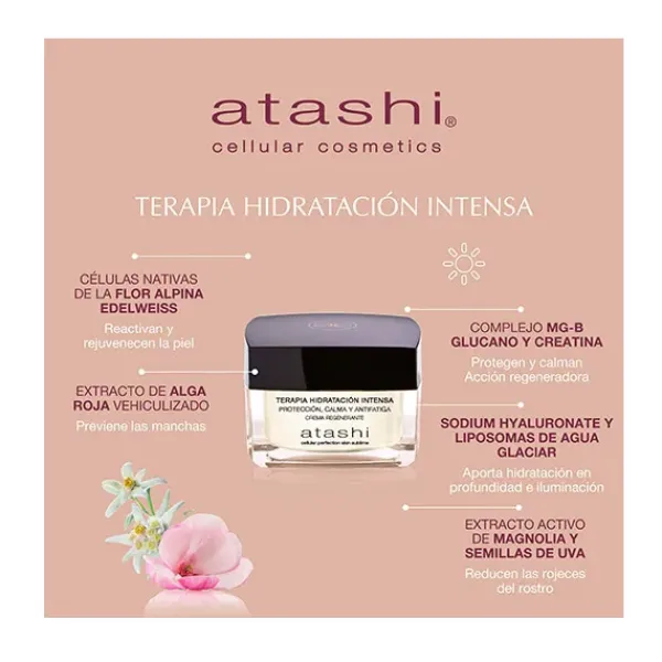 Atashi Terapia de Hidratación Intensa es una crema hidratante regenerante con ácido hialurónico concentrado para tu piel que corrige y frena el envejecimiento de la piel.