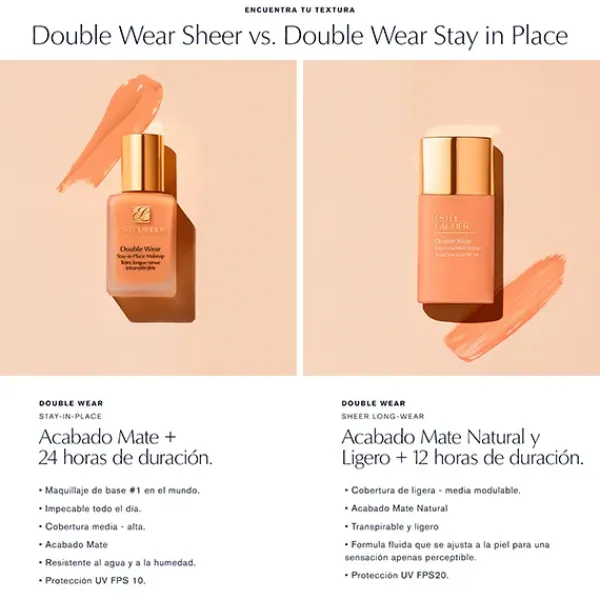 Double Wear Sheer, maquillaje de base con un acabado mate natural, transpirable y ligero, 12 horas de duración. Deja una piel perfecta con un acabado mate fresco y natural. No contiene aceites y controla brillos. Unifica el tono de la piel. Comodidad ligera. La fórmula fluida se ajusta a la piel para una sensación apenas perceptible.