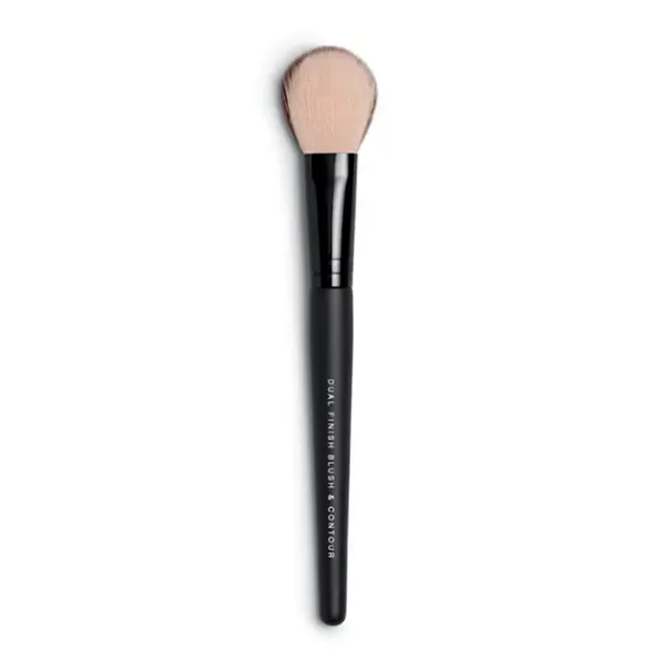 Una brocha de doble extremidad con fibras sintéticas para extender y hacer contouring con coloretes, bronceadores y maquillaje facial líquidos y en polvo.