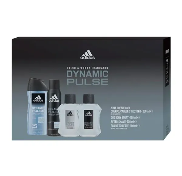 Adidas set Dynamic el regalo perfecto. Una fragancia fresca, ligera y, al mismo tiempo, inconfundible. El eau de toilette para hombre Adidas Dynamic te conquistará con su suave y sofisticada composición aromática, perfecta para usar a diario.