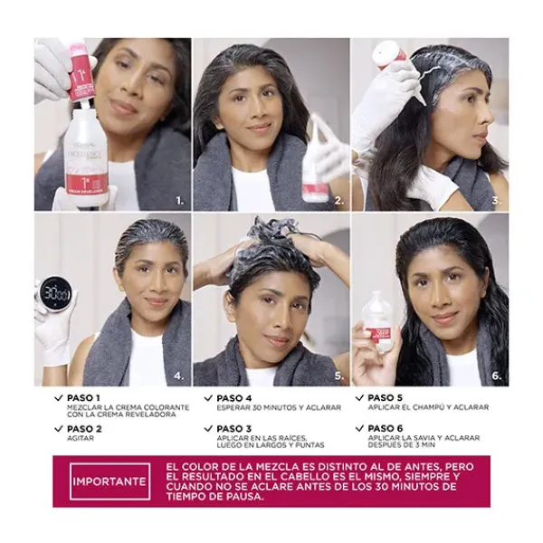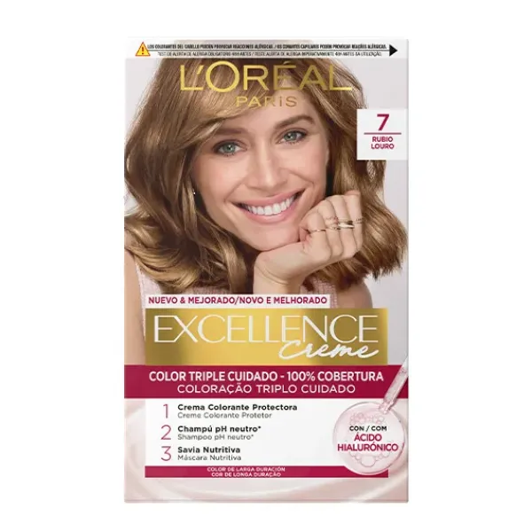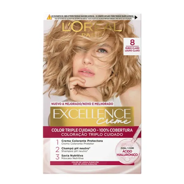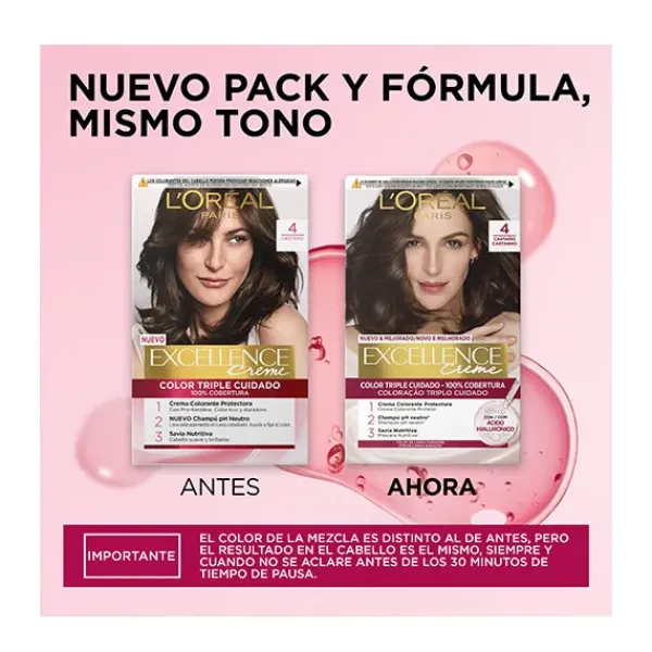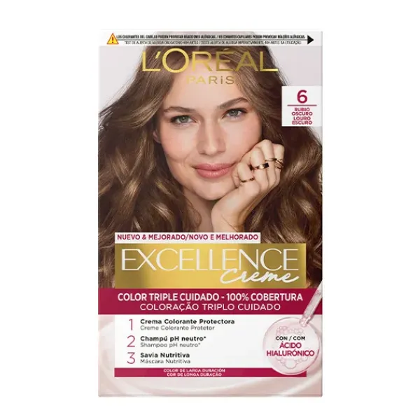 La Crema Color Triple Cuidado Avanzado Excellence, con Pro-Keratina, Ceramida y Ionene G, protege el cabello antes, durante y después de la coloración con un 100% de cobertura de canas.