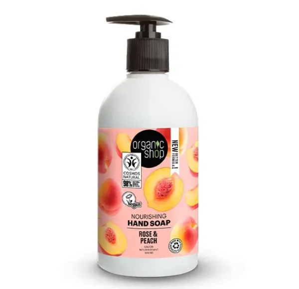 Jabón Líquido Orgánico Melocotón RosaEl jabón líquido de melocotón orgánico y aceite de rosa, también de origen orgánico, limpian la piel y dejan un aroma muy rico en las manos. Además, aportan suavidad y flexibilidad a la epidermis dejando una sensación muy agradable. Organic Shop crea productos libres de tóxicos como parabenos, siliconas o SLS para cuidar la piel en exclusiva con productos de origen vegetal. Además, los jabones líquidos cuentan con la etiqueta orgánica BDIH.Rosa y melocotón para cuidar tus manos.