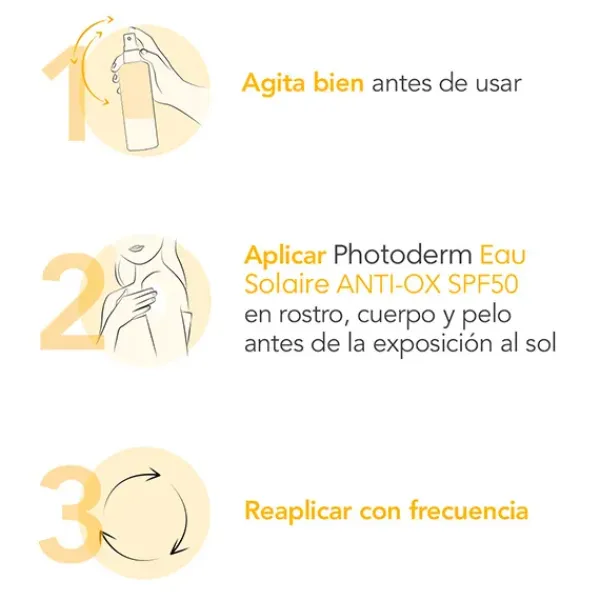 Photoderm Agua Solar ANTI-OX SPF50 es un agua solar que hidrata la piel y ofrece una alta protección solar frente a los rayos UVA/UVB.