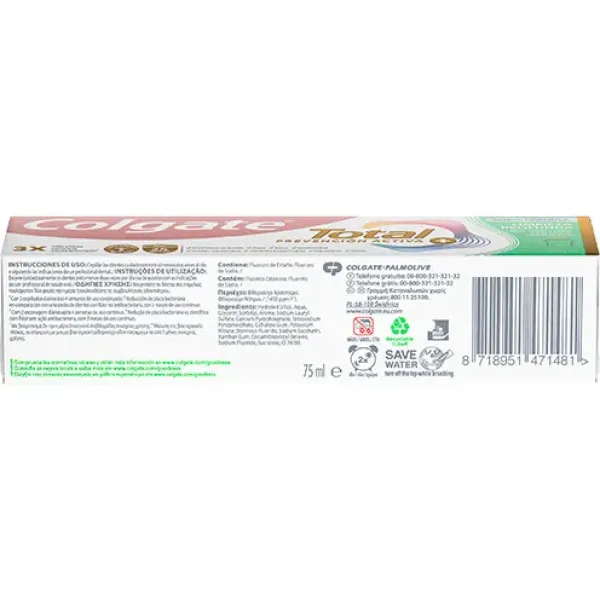 Este dentífrico no sólo ayuda limpiar profundamente en zonas de difícil acceso, sino que además refuerza las defensas naturales de tu boca y proporciona 24h de protección antibacteriana* con su tecnología Zinc-Amino. Es un dentífrico con flúor que protege tus dientes contra la caries, mientras elimina la placa. También revitaliza tus encías, reduce el sarro, blanquea, protege los dientes sensibles y refresca tu aliento para que sonrías con confianza. Dale a tu boca la protección que se merece y mantén tu sonrisa brillante durante todo el día con este dentífrico antibacteriano. Producto reciclable (cartón y tubo).