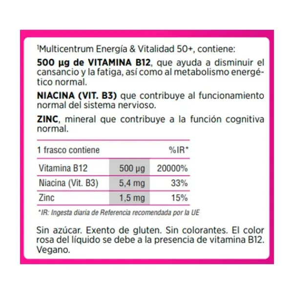 Ayuda a combatir la fatiga, la falta de concentración y el cansancio. Su fórmula está compuesta de: Vitamina B12: que ayuda a disminuir el cansancio y la fatiga , así como el metabolismo energético normal.