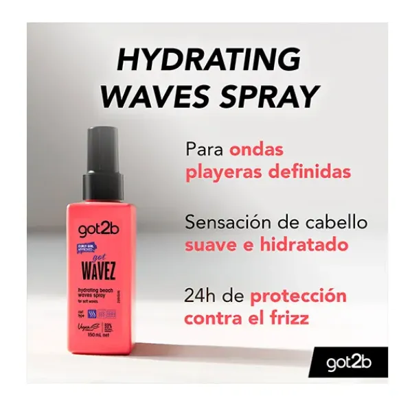 El Spray Wavez Hydrating beach Gotb2 de un look natural de ondas playeras sin resecar el cabello. Sensación de suavidad e hidratación.