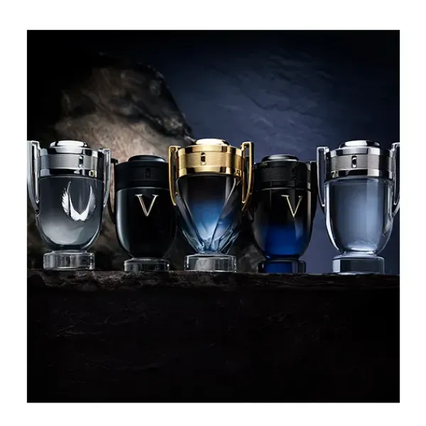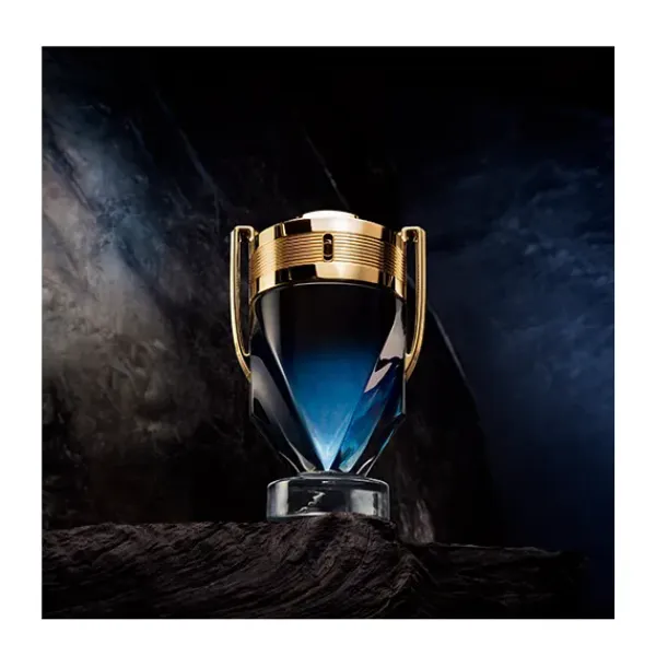 Este perfume amaderado, acuoso y aromático para hombre se presenta en el icónico frasco INVICTUS con forma de trofeo, una silueta en V más marcada y un tapón dorado más poderoso que nunca.