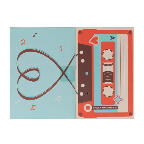 – Postal con dispositivo para grabar y reproducir audio, ideal para regalar a parejas o a cualquier otra persona, ya que el mensaje en ella es lo suficientemente amplio.