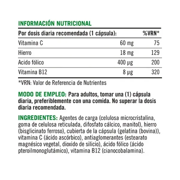 El hierro es el mineral más abundante de la sangre, y combinado con las vitaminas C, B12 y ácido fólico aporta una mezcla de nutrientes para potenciar los niveles de energía y la formación de la sangre.