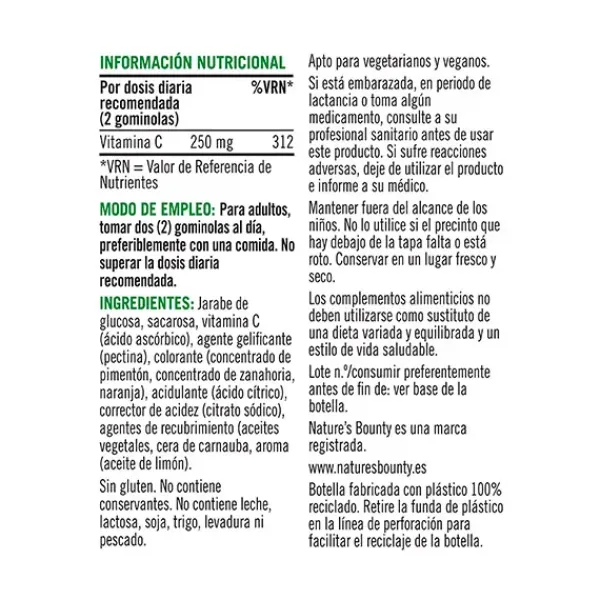 El complemento alimenticio Vitamina C gummies de Nature´s Bounty® contribuye al apoyo inmunológico (1) y a los niveles de energía (2). La vitamina C contribuye a la formación de colágeno en nuestra piel (3). Presentado en gominolas veganas tienen delicioso sabor cítrico. La vitamina C contribuye a la protección de las células del daño oxidativo (4), al metabolismo energético normal (2) y a reducir el cansancio y la fatiga (5).