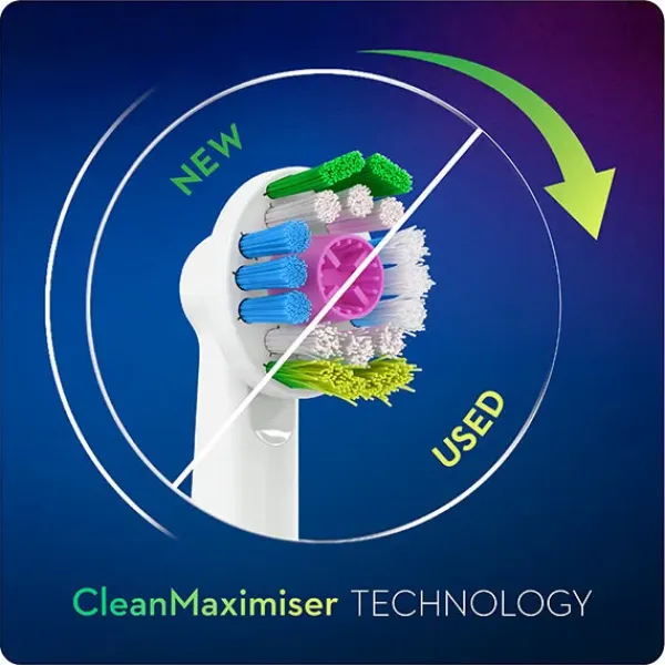 Inspirado en las herramientas profesionales, el cabezal 3DWhite está diseñado para limpiar diente por diente. Presenta una pieza pulidora de diseño especial que ayuda a eliminar las manchas en la superficie mientras que los filamentos eliminan la placa, lo cual proporciona un resultado ideal para conseguir una limpieza y blanqueamiento superiores. También es capaz de blanquear los dientes en dos semanas eliminando las manchas en la superficie.