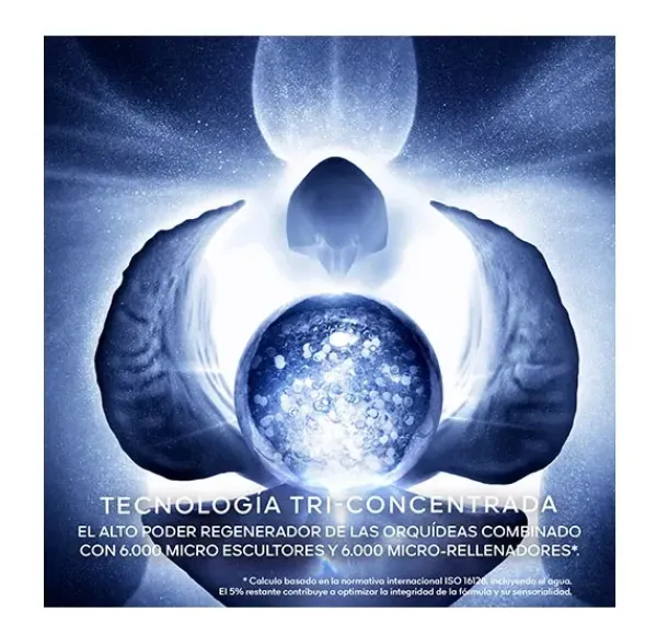 El excepcional tratamiento completo concentra por primera vez el poder de 6000 microescultores³ y 6000 microrellenadores³ en la esencia regeneradora de orquídeas² para lograr la metamorfosis de la piel en 3 dimensiones. La tez queda altamente regenerada, reafirmada y esculpida. Evaluación realizada por un panel de mujeres. Los volúmenes faciales se realzan en un 32%⁴.
