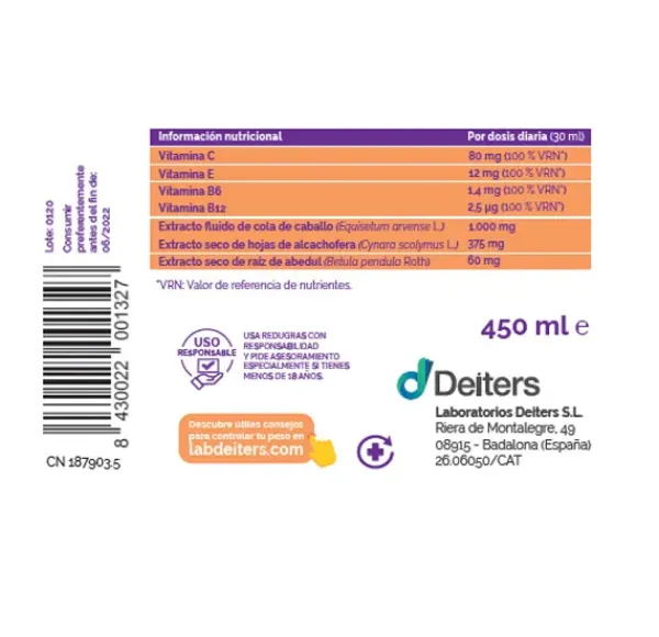 La cola de caballo realiza una función drenante, depurativa y remineralizante. El abedul1 promueve el proceso de detoxificación y ayuda a la digestión. La alcachofera2 contribuye a reducir los niveles de lípidos en sangre y ayuda a la detoxificación por sus propiedades depurativas. Las vitaminas C y E4 contribuyen a la protección de las células del daño oxidativo. Las vitaminas B6 y B125 contribuyen al metabolismo energético normal y a reducir el cansancio y la fatiga