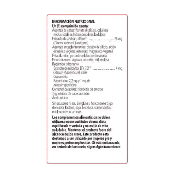 Está formulado sin hormonas, y combina dos ingredientes botánicos patentados y clínicamente estudiados: azafrán (affron®) y ruibarbo siberiano (ERr-731®) que han demostrado que apoyan el cuerpo y la mente