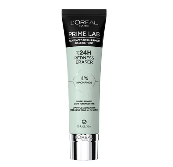 Prime Lab Redness Eraser es la última incorporación a la familia de primers dermocosméticos de L’Oréal Paris. Formulado con un 4% de NIACINAMIDA, corrige instantáneamente las rojeces neutralizándolas gracias a su tono verde hasta 24h*.