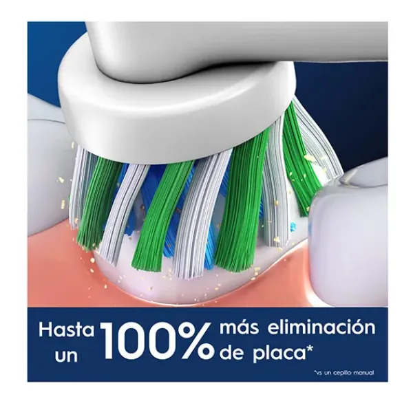 El cabezal del cepillo de dientes Oral-B Pro CrossAction cuenta con más de 2200 filamentos perfectamente inclinados para eliminar hasta un 100 % más de placa bacteriana y conseguir unos dientes más limpios y sanos en comparación con un cepillo de dientes manual.