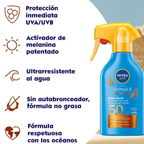 NIVEA SUN Protege & Broncea Spray Solar FP 50 proporciona protección UV inmediata y un bronceado natural de la piel gracias al extracto pro-melanina que estimula la propia melanina de la piel. Para un bronceado bonito y saludable. Fórmula no grasa, resistente al agua y sin autobronceador. Fórmula Respetuosa con los Océanos: sin los filtros UV Octinoxato, Oxibenzona ni Octocrileno. Sin Microplásticos. Fórmula 63% Biodegradable.