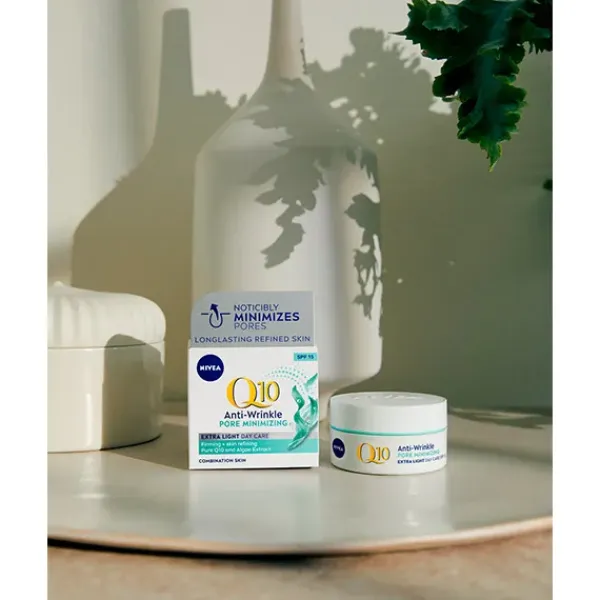 NIVEA Q10 Antiarrugas Crema de Día Antiarrugas Minimiza Poros es una crema extra ligera con Coenzima Q10 100% IDÉNTICA a la de la piel que minimiza los poros y es ideal para la piel mixta. Protege las células de la piel frente a los agresores externos y recarga la piel de energía, mejorando su regeneración*. Contiene además extracto de algas, conocido por sus propiedades antibacterianas. Su fórmula purificante de textura ligera reduce visiblemente las arrugas y reafirma la piel. En 24 horas, minimiza los poros visiblemente en un 14%**. Su FP15 protege frente a la radiación UVA/UVB, causante del envejecimiento prematuro de la piel. Dermatológicamente comprobado. No comedogénico – no obstruye los poros. in-vitro *Estudio de 2 semanas, 31 mujeres, 2019.