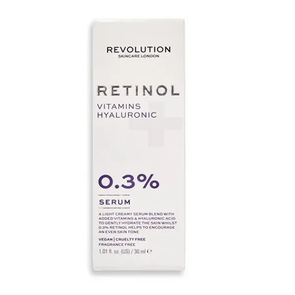 Continúa tu viaje de retinol con Revolution Skincare 0.3% Retinol con Vitaminas y Sérum de Ácido Hialurónico.