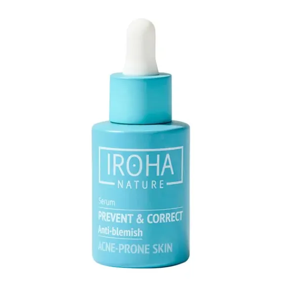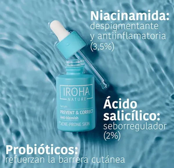 Sérum Previene y Corrige Antiimperfecciones de Iroha Nature, un tratamiento a base de 2% ácido salicílico, 3,5% Niacinamida y probióticos que elimina y mejora las marcas y cicatrices post-granos, mejora la textura de la piel, unifica el tono de la piel e impide la aparición de nuevos brotes de granos, impidiendo que se reproduzca la bacteria causante de ellos, C. Acnes. Su fórmula efectiva y altamente concentrada, con resultados probados y testada dermatológicamente, presenta una textura ligera y fluida que se absorbe rápidamente, con un acabado no pegajoso.