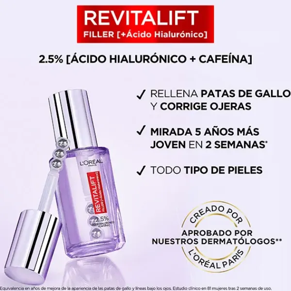 Serum de ojos Revitalift Filler con Ácido Hialurónico que hidrata intensamente y rellena las líneas alrededor de los ojos, y cafeína que revitaliza la piel para reducir ojeras y bolsas.