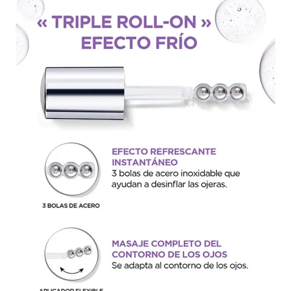 Efecto refrescante instantáneo gracias a su aplicador flexible en formato roll-on con 3 bolas de acero inoxidable, que ayudan a desinflar las ojeras y se adapta al contorno de los ojos.