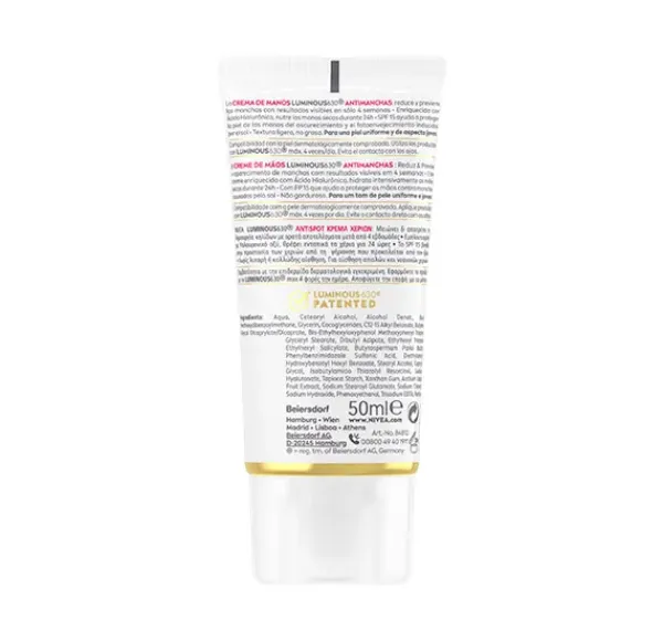 Luminous Crema de manos: NIVEA Luminous630® Antimanchas Crema de Manos Avanzada nutre intensivamente la piel de las manos mientras reduce las manchas y previene su aparición.