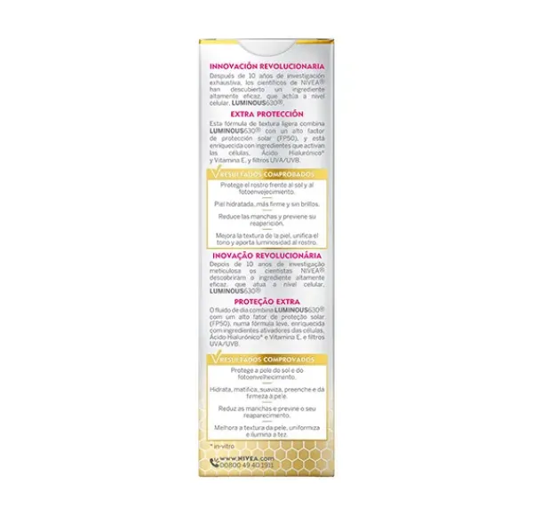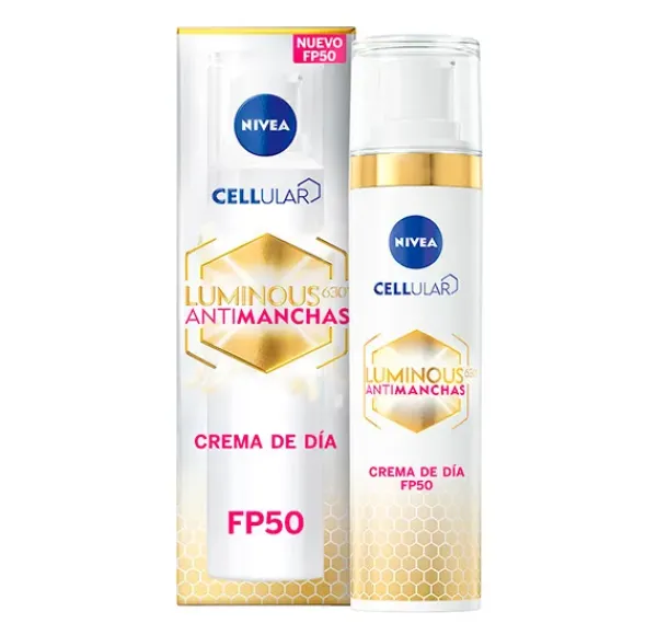LUMINOUS630 ANTIMANCHAS CREMA DE DÍA SPF50: NIVEA Cellular Luminous630 Antimanchas Crema de día SPF50, es una fórmula extra protectora y de textura ligera que combina el ingrediente altamente eficaz LUMINOUS630® con un alto factor de protección solar (SPF50), y está enriquecida con Ácido Hialurónico, Vitamina E y filtros UVA/UVB.