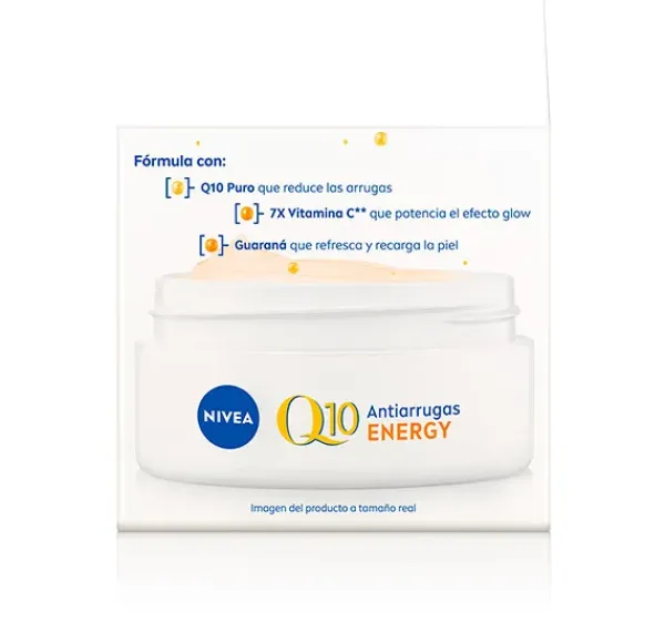 Q10 ENERGY Crema de Día Antiarrugas Energizante SPF15: Esta nueva fórmula de la Crema de Día Iluminadora Q10 Energy contiene Q10 Puro, 7X Vitamina C* y Guaraná, para reducir las arrugas, potenciar el efecto glow, y refrescar y recargar la piel. Consigue un glow instantáneo y una piel uniforme gracias a sus poderosos ingredientes.