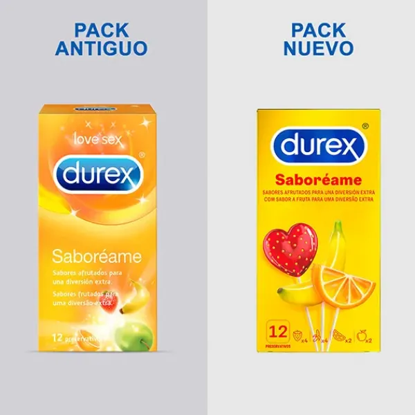 Los preservativos Durex Saboréame están compuestos por preservativos sabor Fresa, Plátano, Naranja y Manzana para una diversión extra. Estos condones son lubricados y de forma recta con depósito.