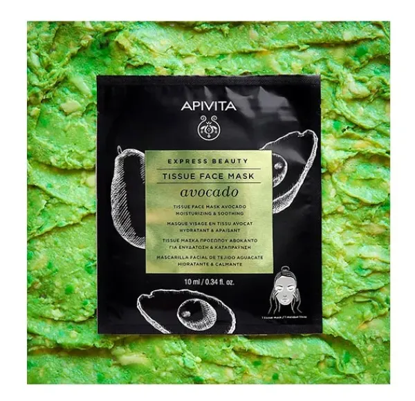 Esta mascarilla de tejido de biocelulosa semitransparente está formulada con coco y enriquecida con aceite de aguacate.