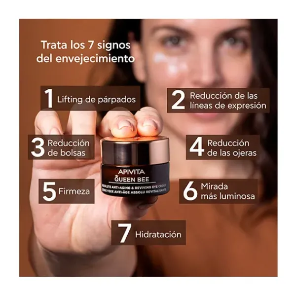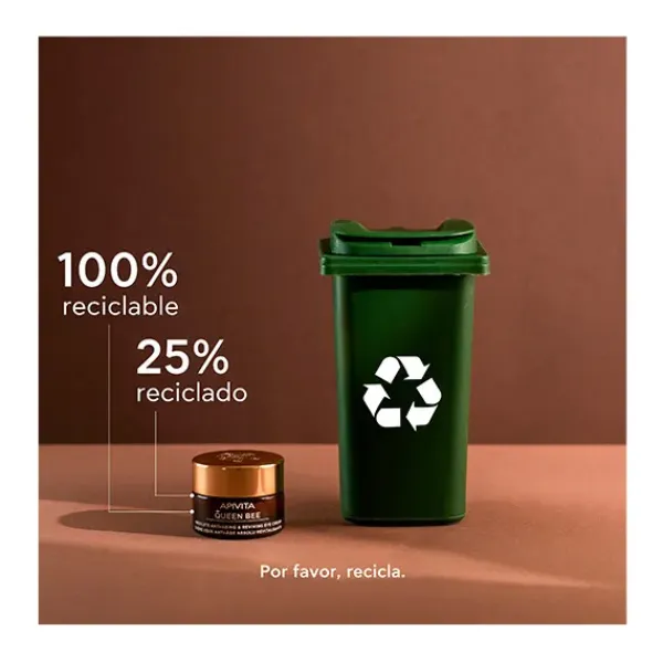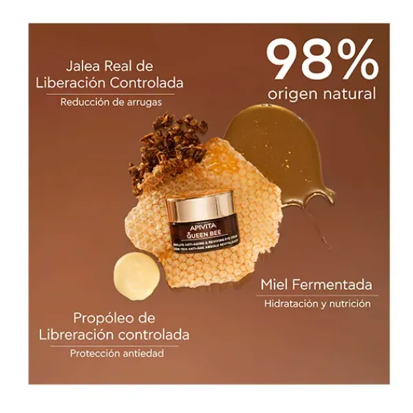 Ilumina, revitaliza el contorno de los ojos y ayuda a reparar los signos visibles causados por la fatiga, los rayos UV, la contaminación e incluso la luz azul con Propóleo de liberación controlada, Miel fermentada de APIVITA e infusión de rosa salvaje.