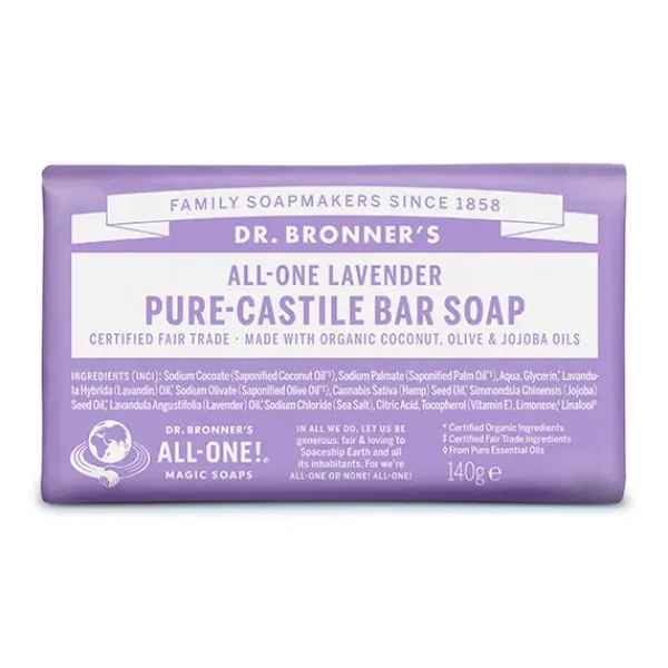 Pastilla de Jabón de Castilla Puro de Dr. Bronner’s de Lavanda. ¡Espuma suave y sedosa!¡Perfumada con aceites puros de lavanda y lavandín para calmar la mente y el cuerpo!
