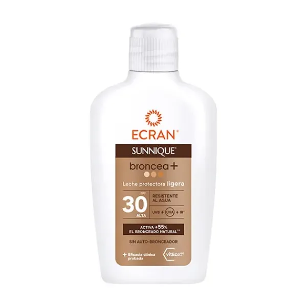 Leche protectora ligera broncea +, activa +55% el bronceado natural. Con protección UVB + UVA y del efecto de los infrarrojos.