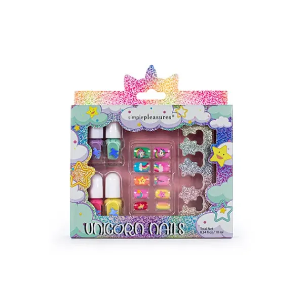 Contiene cuatro esmaltes de tonos vivos, uñas postiza con diseños mágicos y separador de uñas.