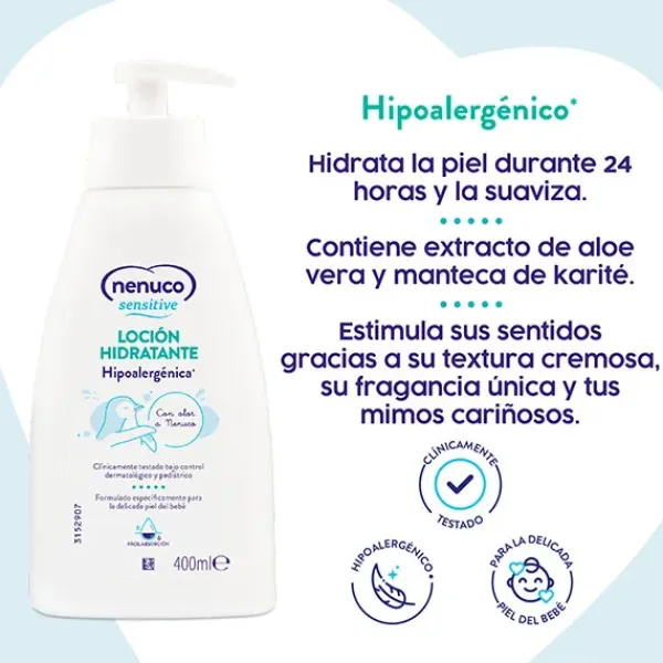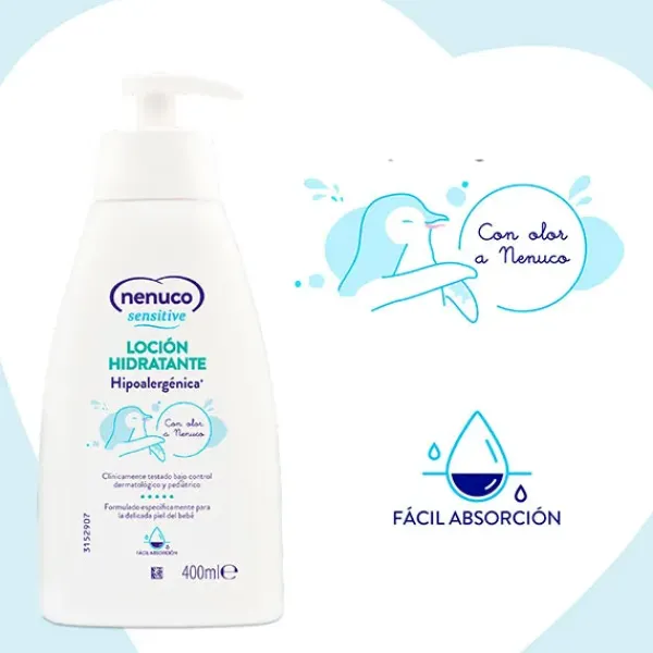 La Loción Hidratante de Nenuco Sensitive es hipoalergénica, formulada específicamente para la delicada piel del bebé.