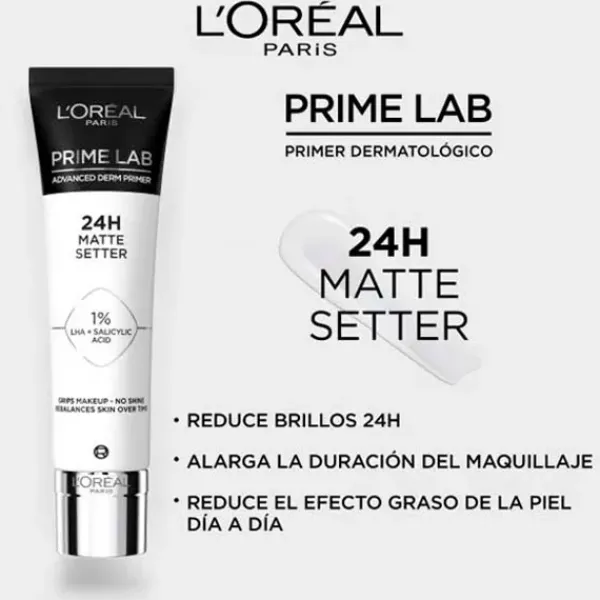 El primer de L’Oréal Paris Prime Lab 24H Matte Setter, alisa la piel de forma perfecta, la prepara para la aplicación de maquillaje y garantiza que el maquillaje aguante más tiempo, hasta 24h.