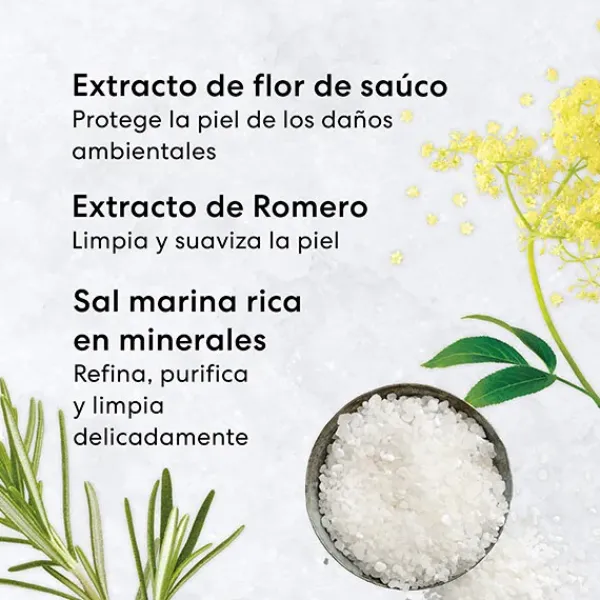 Formulado con sales marinas ricas en minerales y extractos de flor de saúco y romero, limpia la piel de una manera eficaz y suave. Para todos tipo de piel.