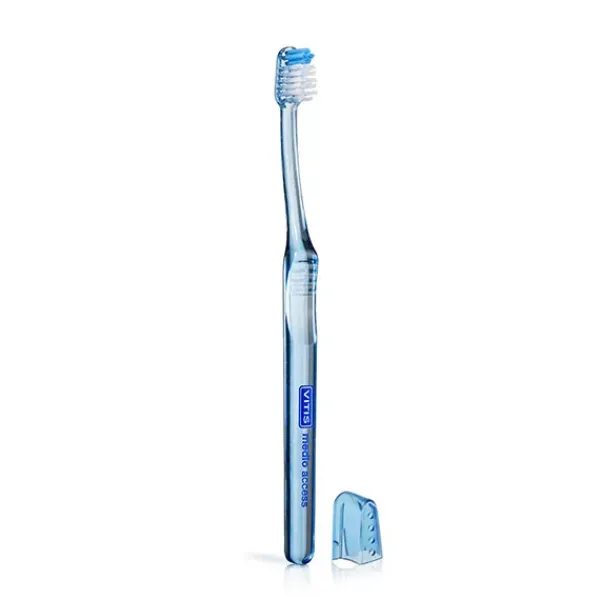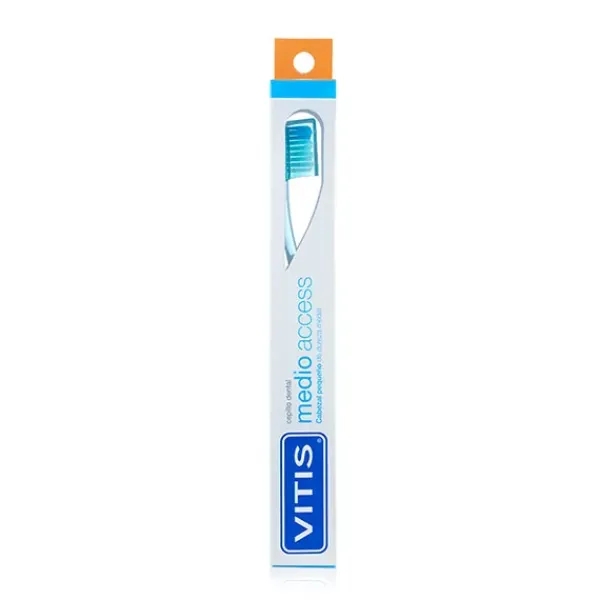 VITIS® medio access es un cepillo de uso diario con cabezal de tamaño pequeño que permite acceder fácilmente a las zonas posteriores de la boca y disminuir los posibles reflejos nauseosos.